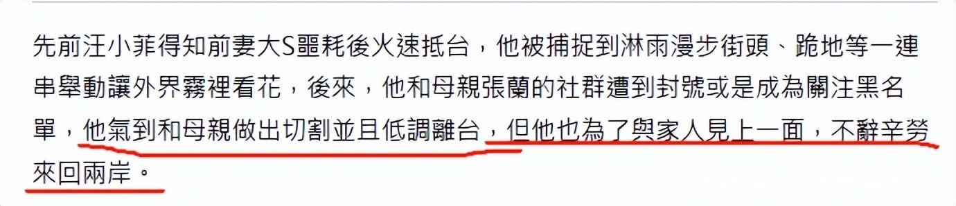 说汪小菲在前妻去世后,淋雨漫步街头、跪地等一连串举动让外界雾里看花,后来他和张兰账号被封,又气到和母亲断绝关系。但为了和家人见上一面,又不辞辛苦来回两岸。
