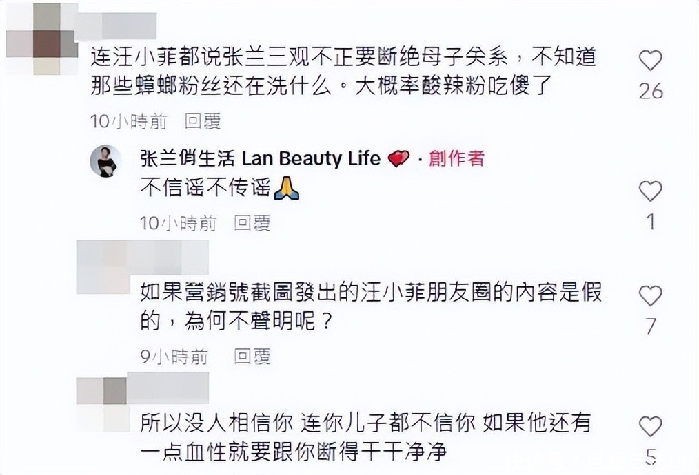 加上张兰本人还亲自辟谣,让大家别信谣传谣,言外之意她和汪小菲断绝关系的消息是假的。所以直接说汪小菲断绝了母子关系,又为家人两岸来回奔波,也有点主观了。