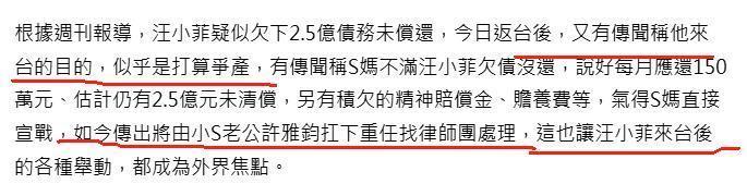 汪小菲离台的这几天,S妈又是发文上战场,被台媒曝出要跟汪小菲争孩子的抚养权,又是被曝出要向汪小菲讨回2.5亿元的债务,让小S老公许雅钧找律师团。